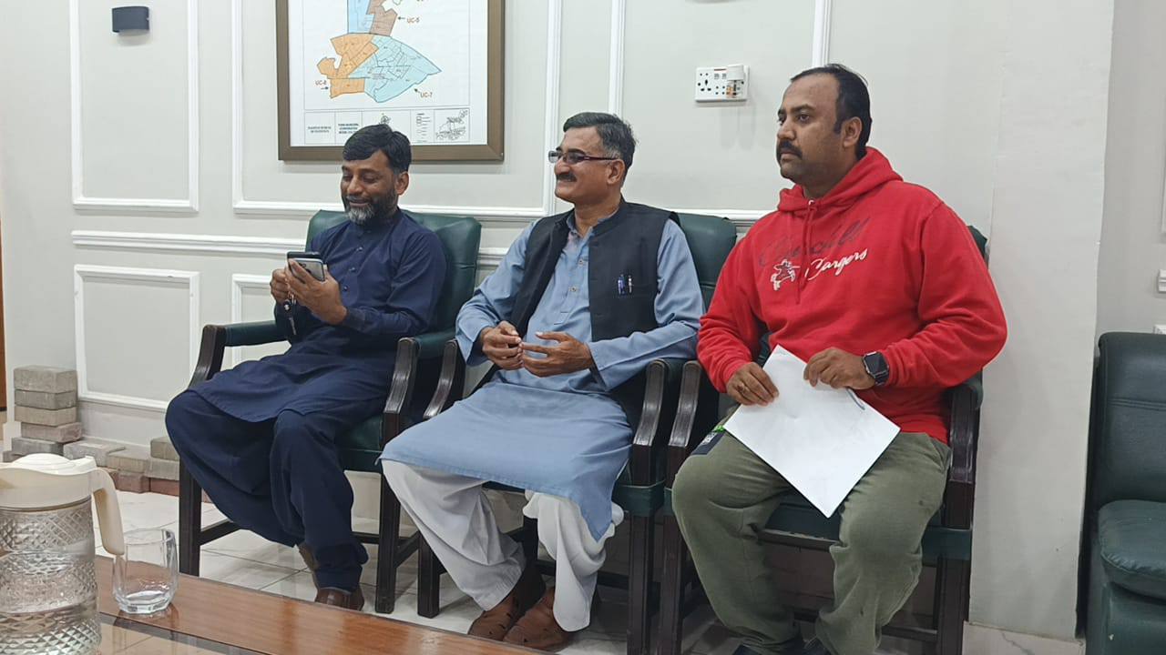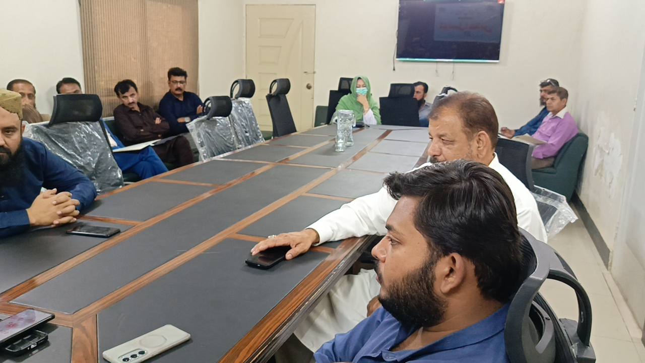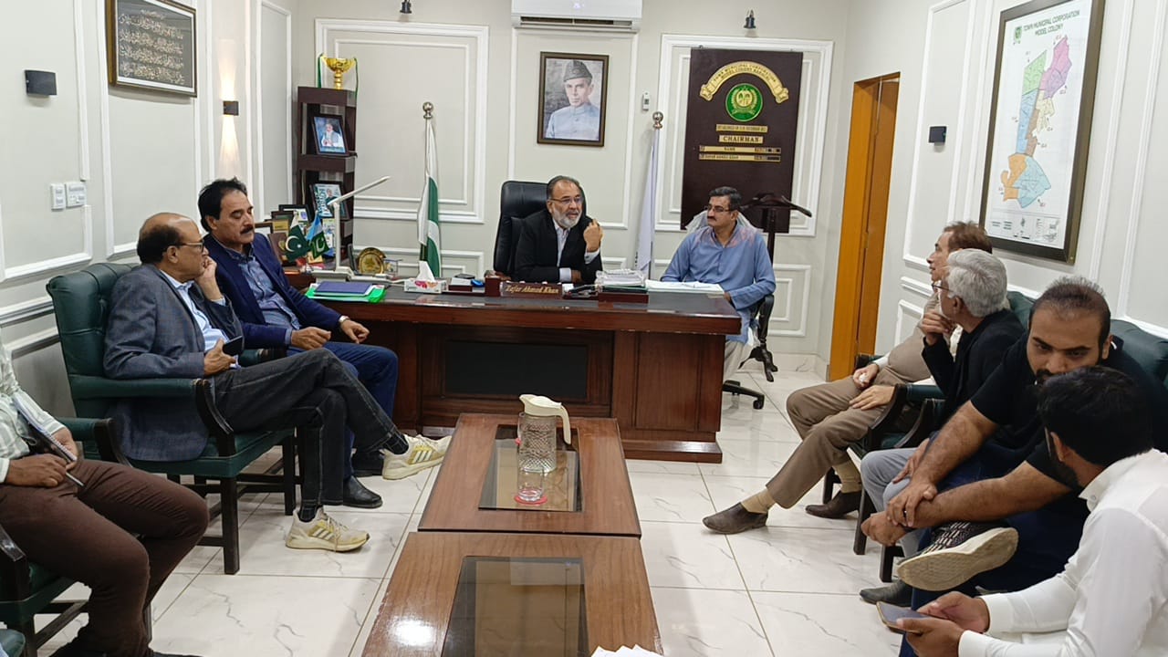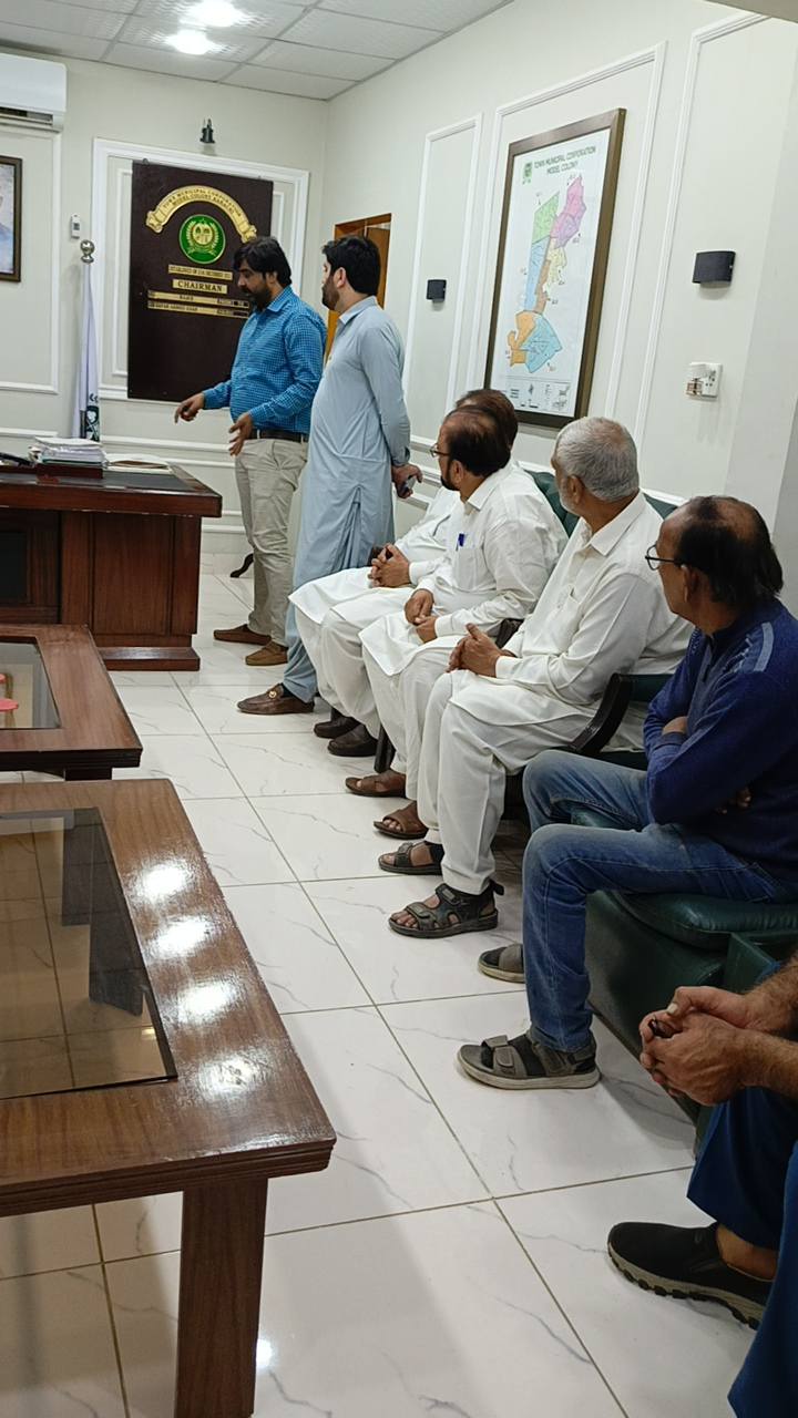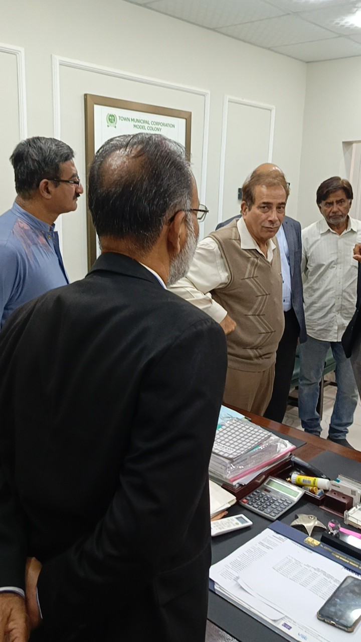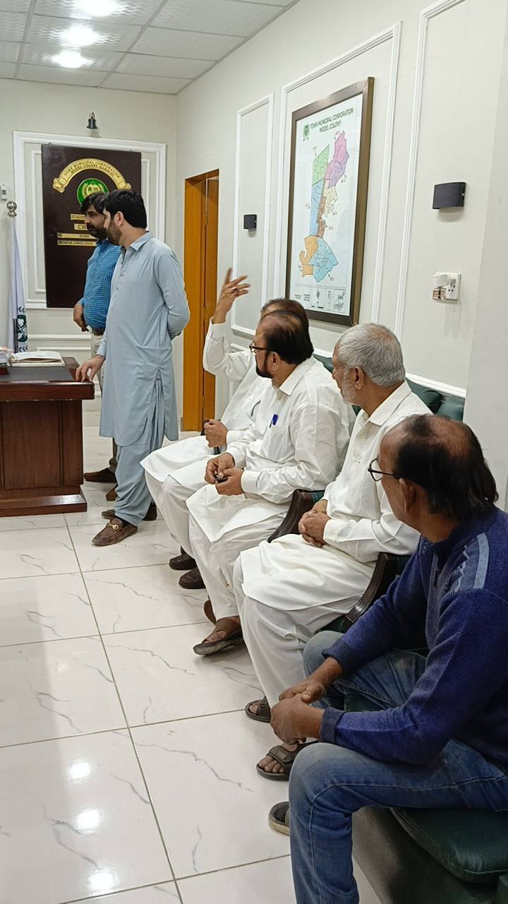 چیئرمین ٹاؤن میونسپل کارپوریشن ماڈل کالونی ظفر احمد خان کی زیرِ صدارت ماڈل کالونی ٹاؤن کے محکمہ جاتی افسران کا اجلاس۔