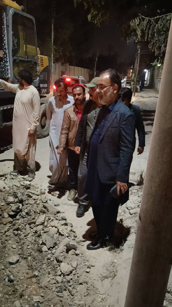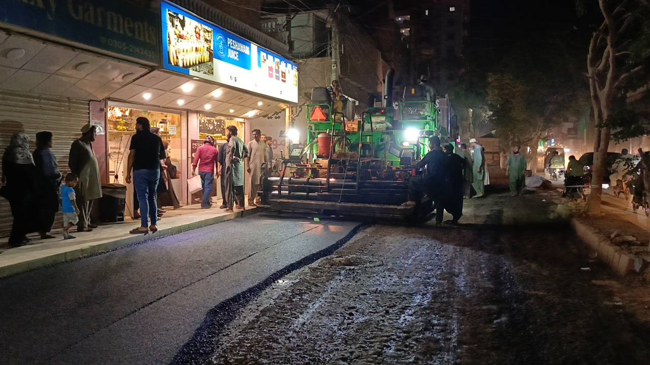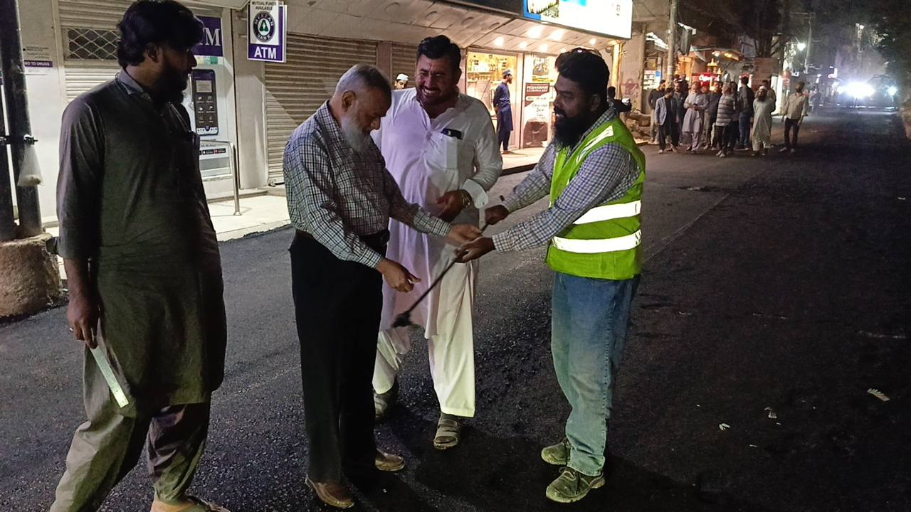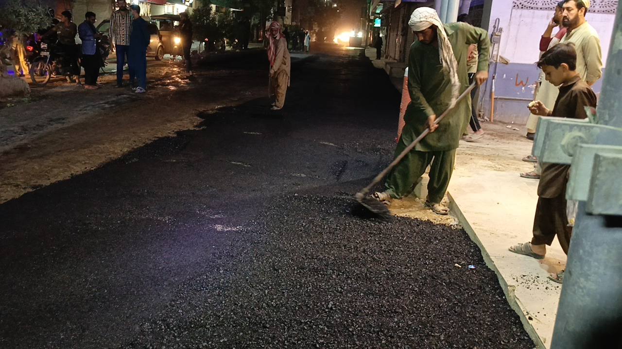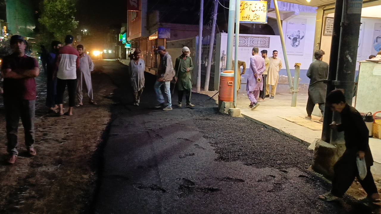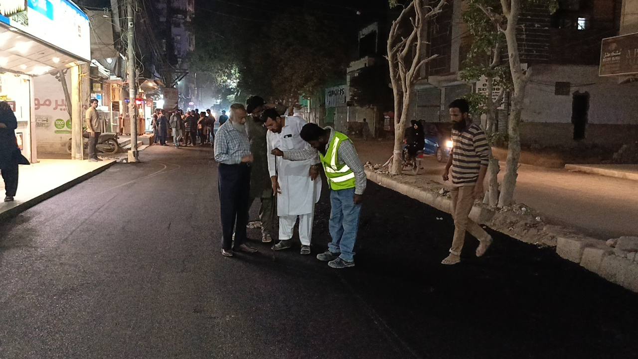 نو تعمیر شدہ سڑک پر ٹاؤن چیئرمین ظفر احمد خان کی ہدایت پر ٹاؤن کورآرڈینیٹر سید مبرور الحق موبی، ولید لالا کی نگرانی میں اسٹریٹ لائٹس کی تنصیب کا کام جاری ہے۔
