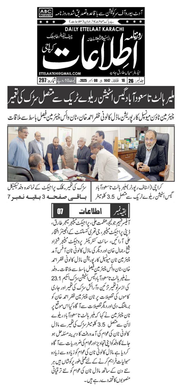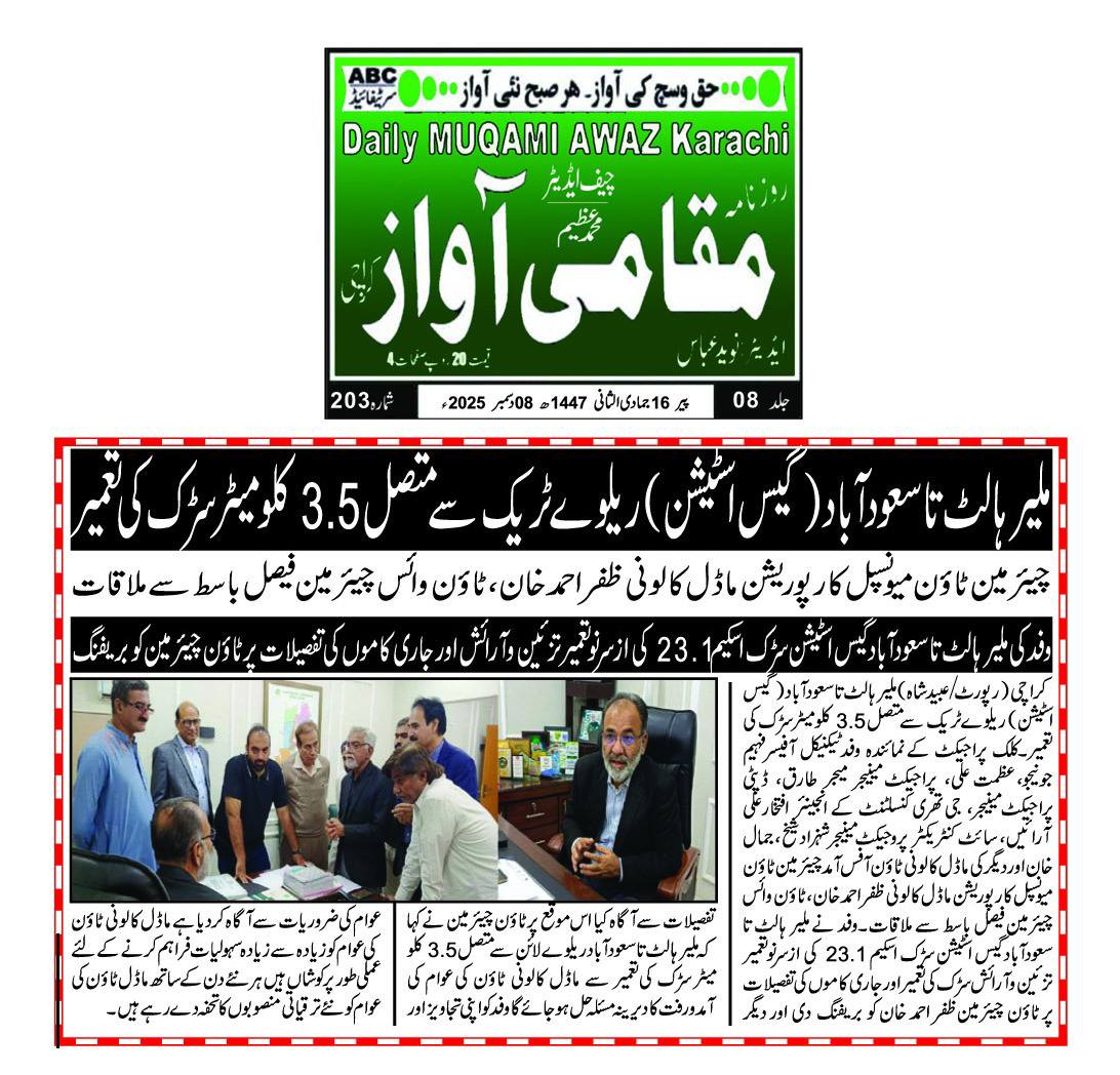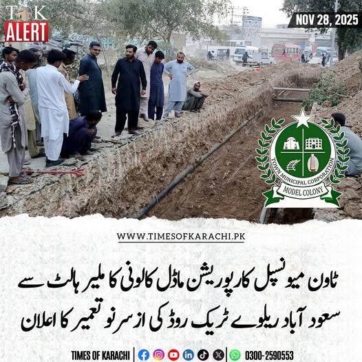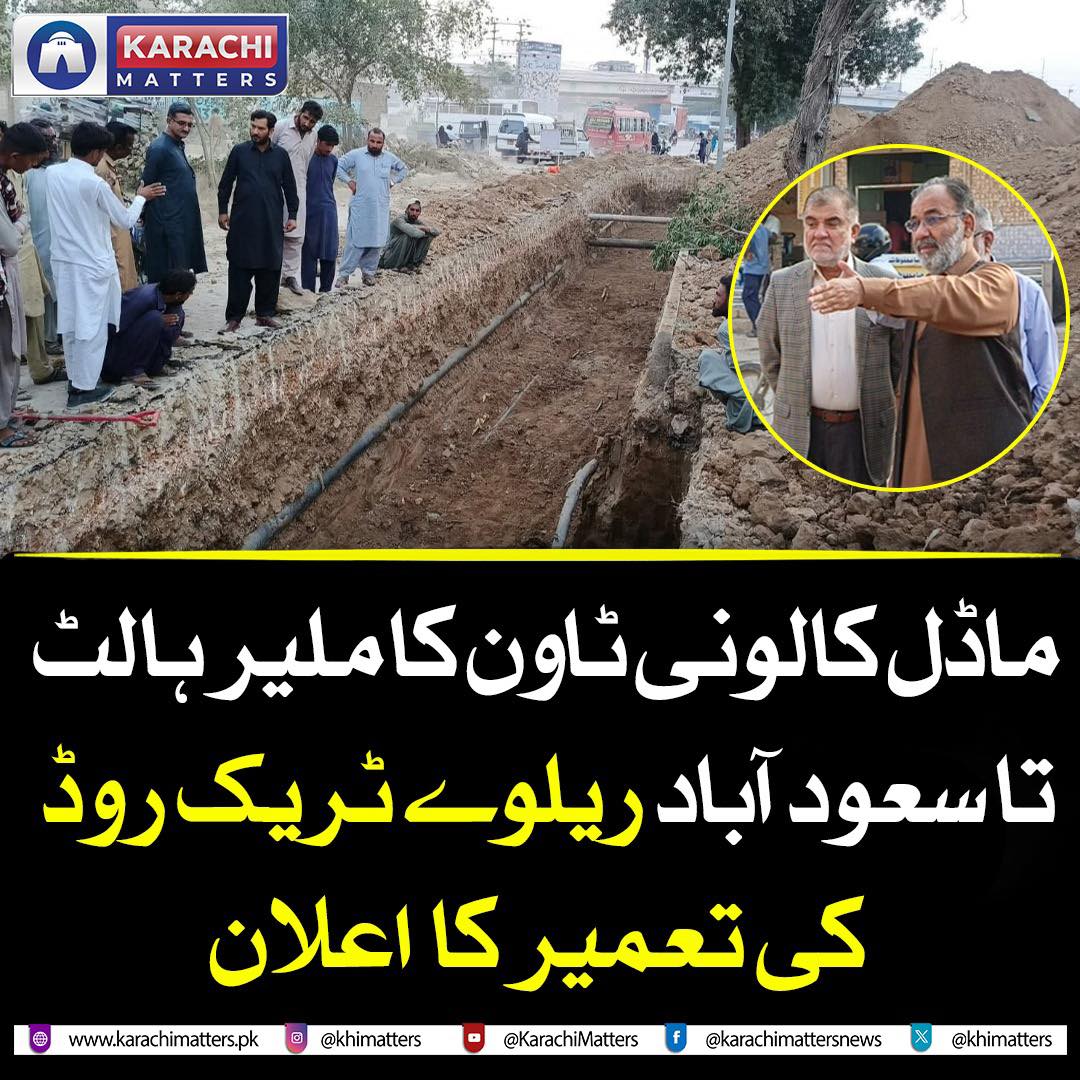ٹاؤن میونسپل کارپوریشن ماڈل کالونی نے ملیر ہالٹ تا سعودآباد ریلوے ٹریک روڈ کی ازسرنو تعمیر کا اعلان کردیا ہے