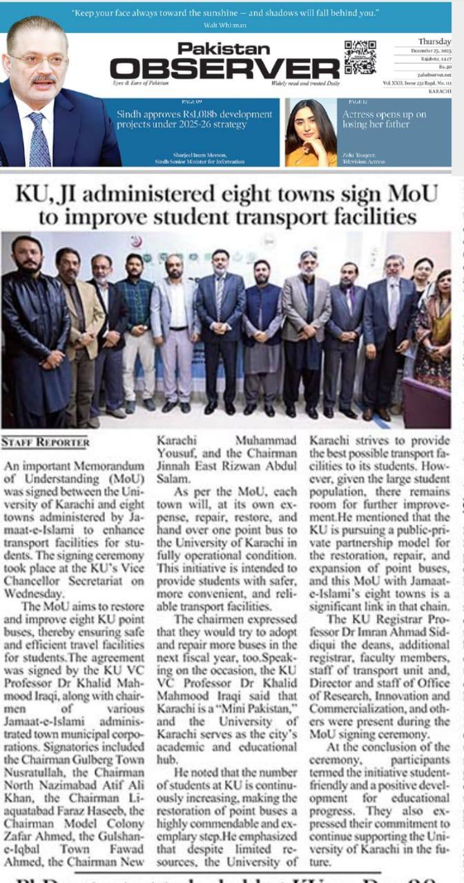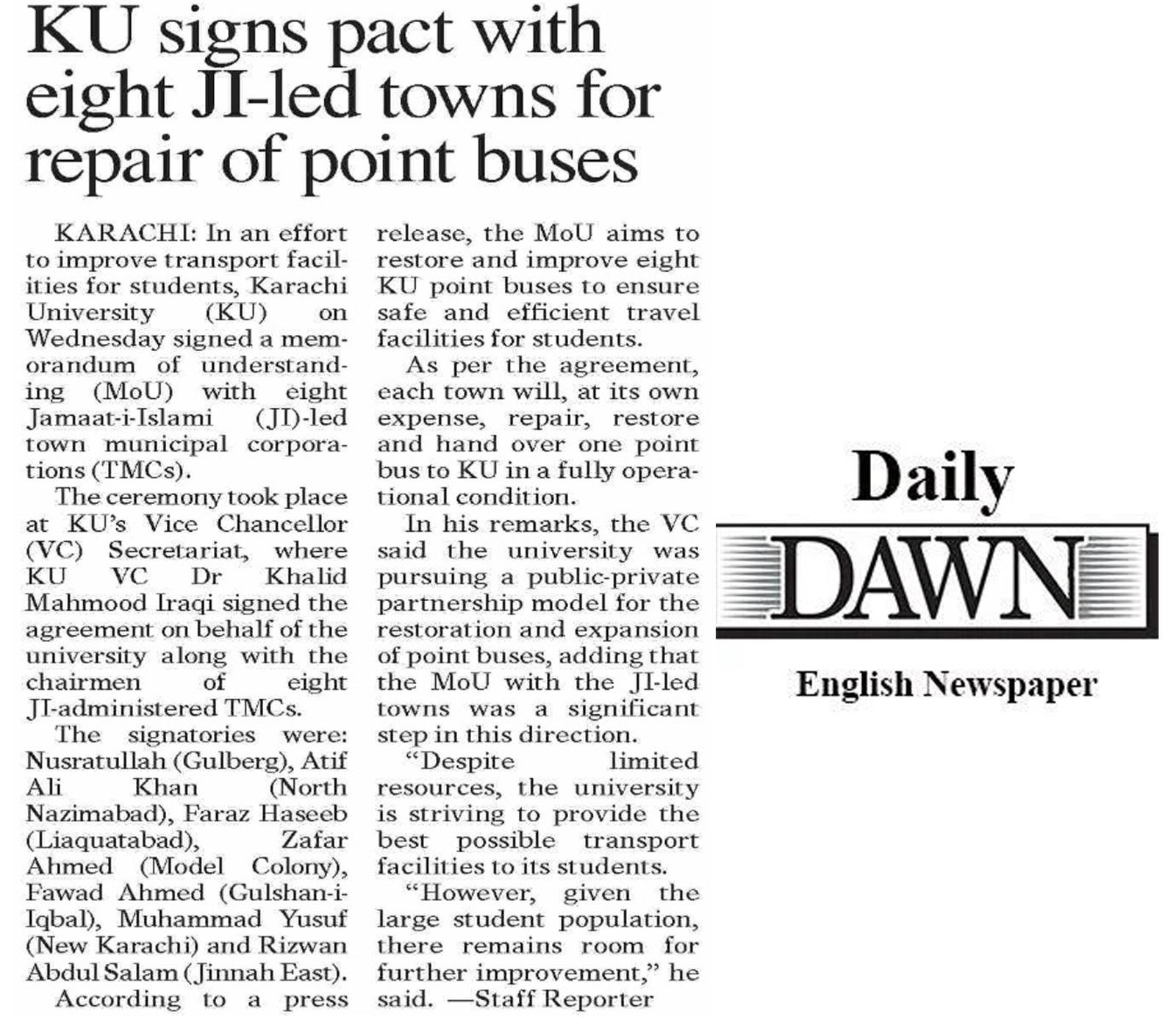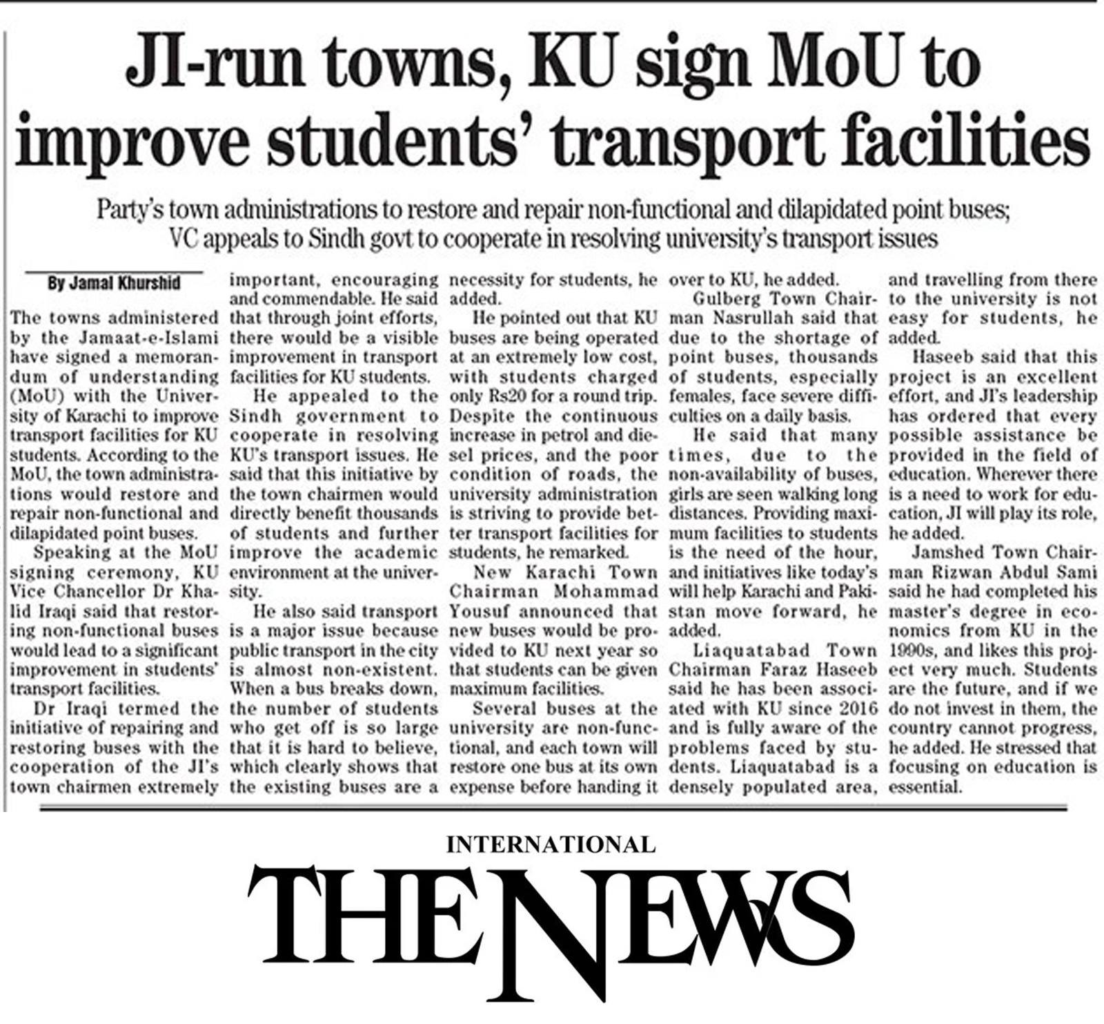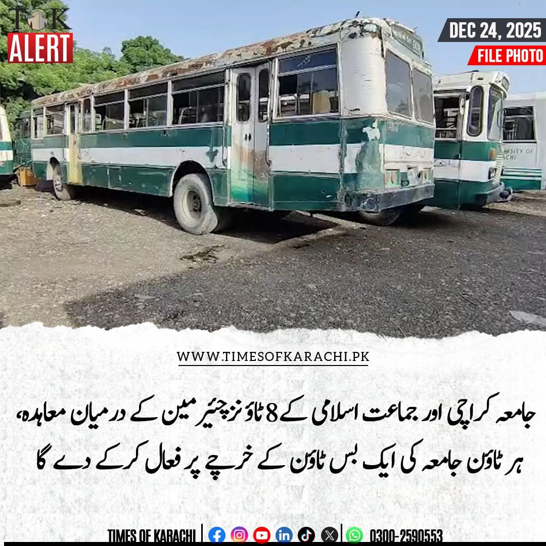 جامعہ کراچی اور جماعت اسلامی کے 8 ٹاؤنز چیرمینز کے درمیان معاہدہ ہوگیا ہے کہ ہر ٹاؤن جامعہ کراچی کی ایک بس ٹاؤن کے خرچے پر فعال کرکے دے گا۔
