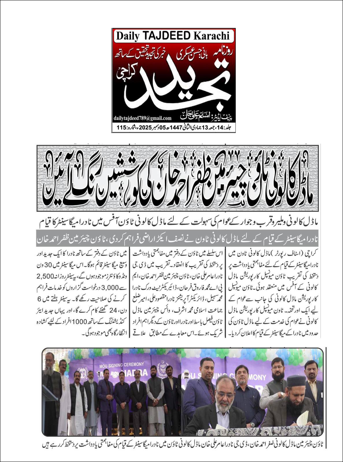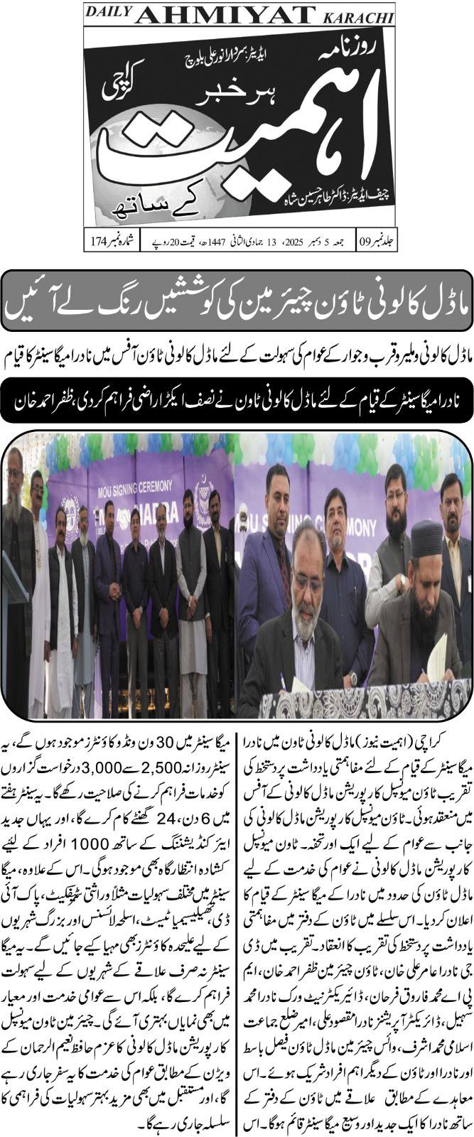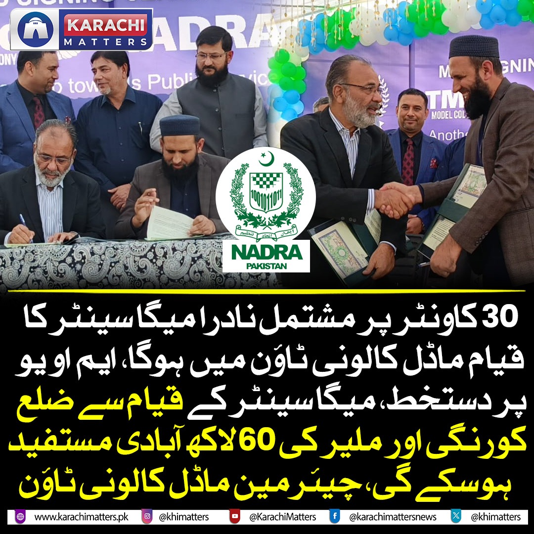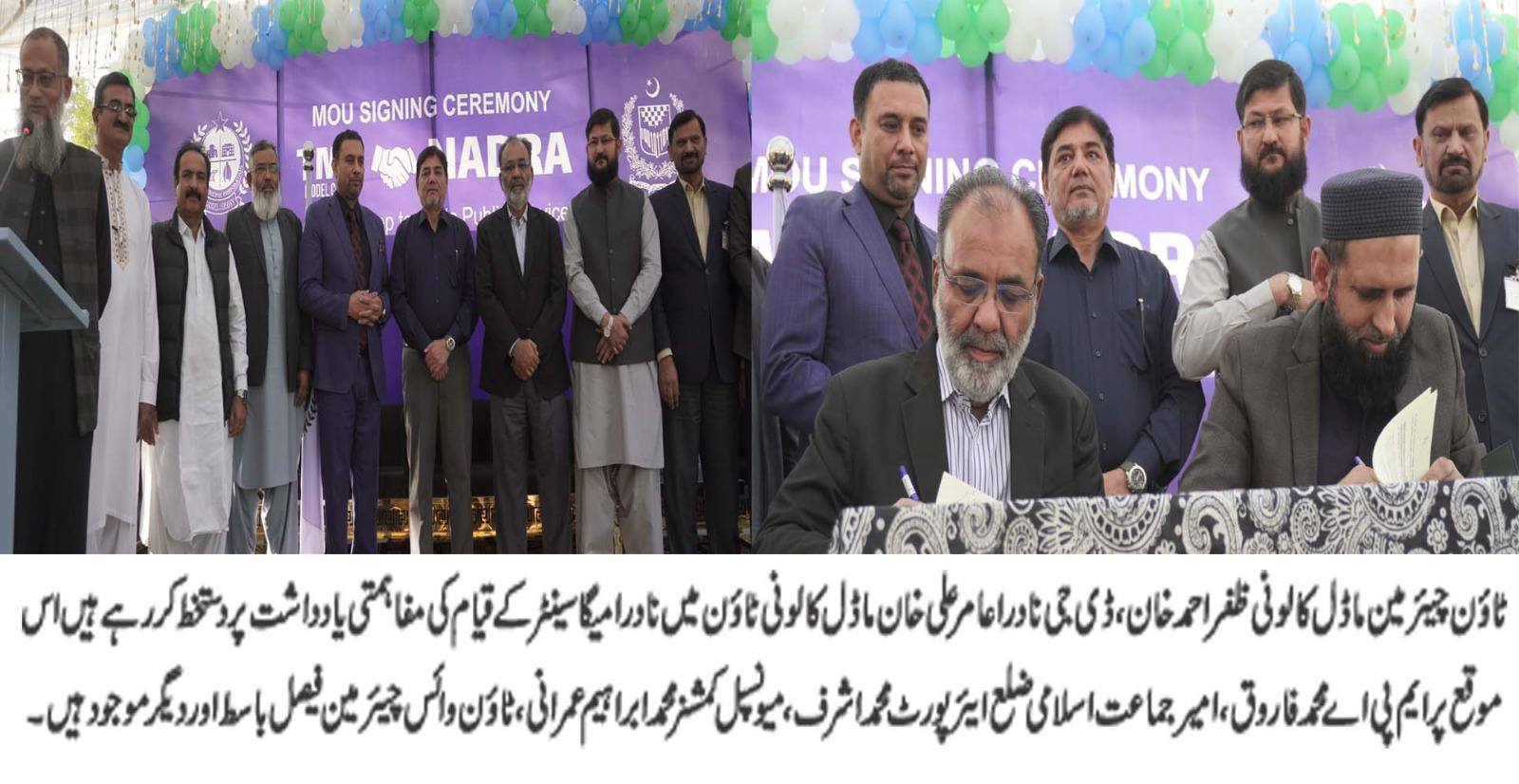 ٹاون میونسپل کارپوریشن ماڈل کالونی نے عوام کی خدمت کے لیے ماڈل ٹاؤن کی حدود میں نادرا کے ایک گرینڈ میگا سینٹر کے قیام کا اعلان کردیا۔ اس سلسلے میں ٹاؤن کے دفتر میں مفاہمتی یادداشت پر دستخط کی تقریب کا انعقاد