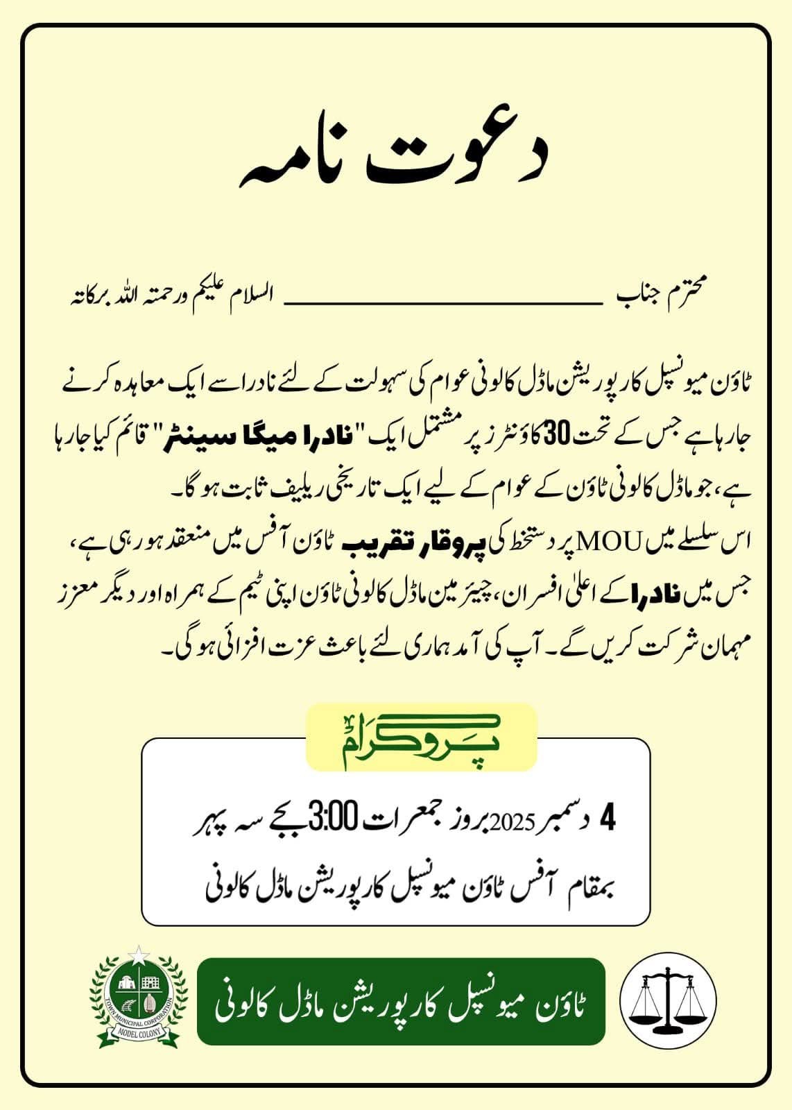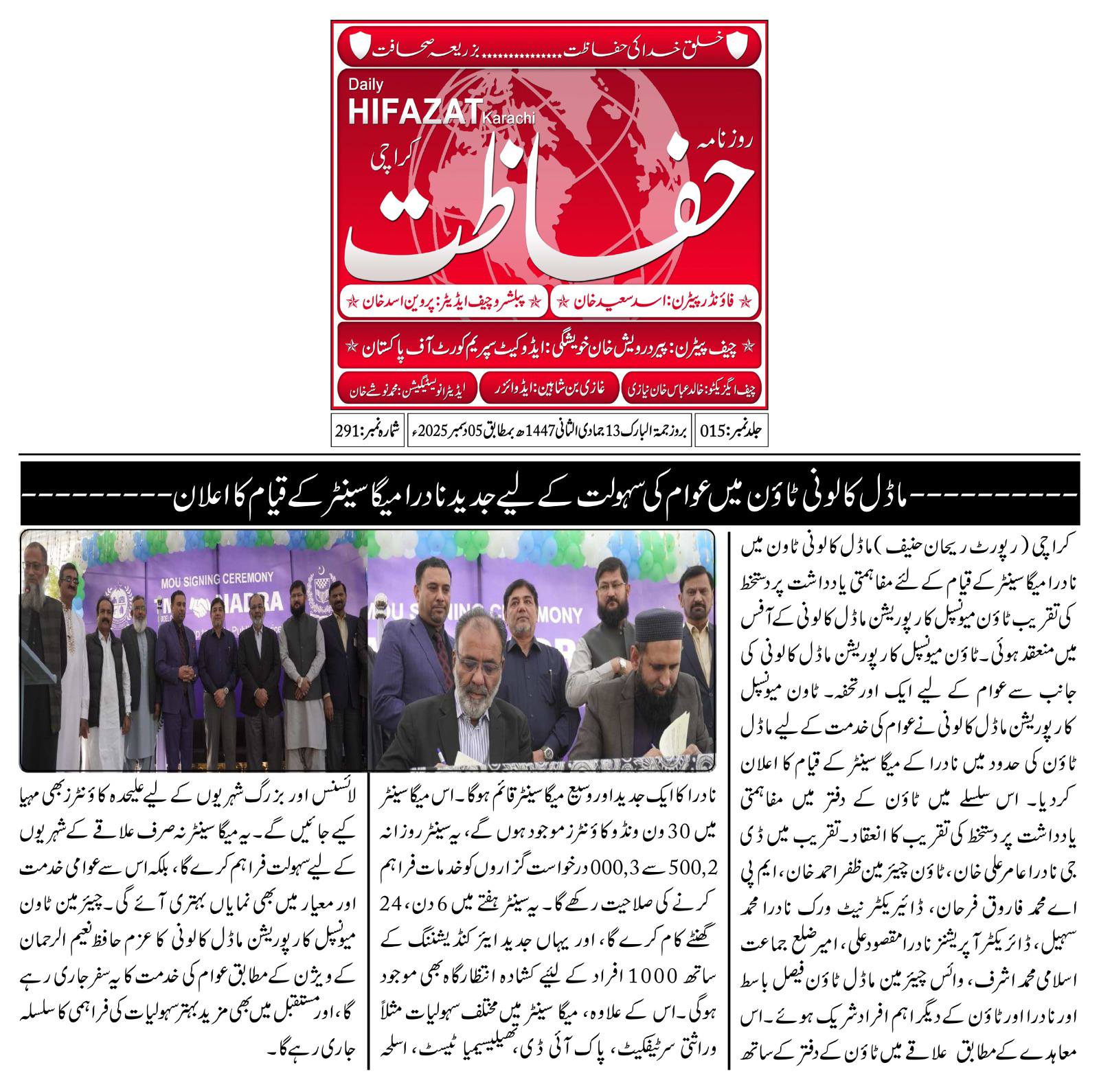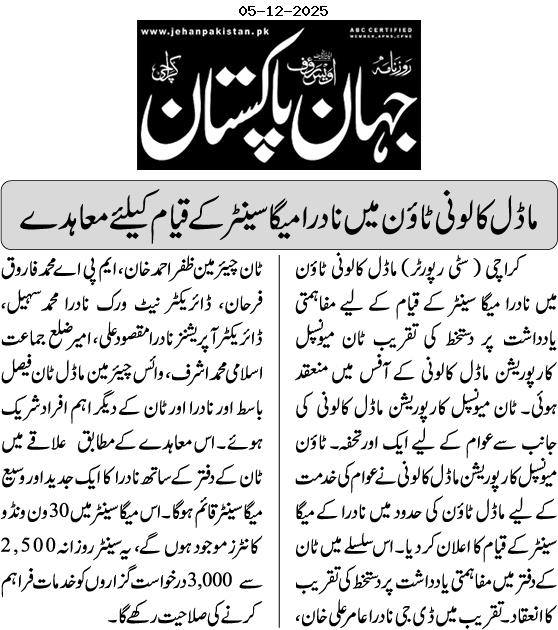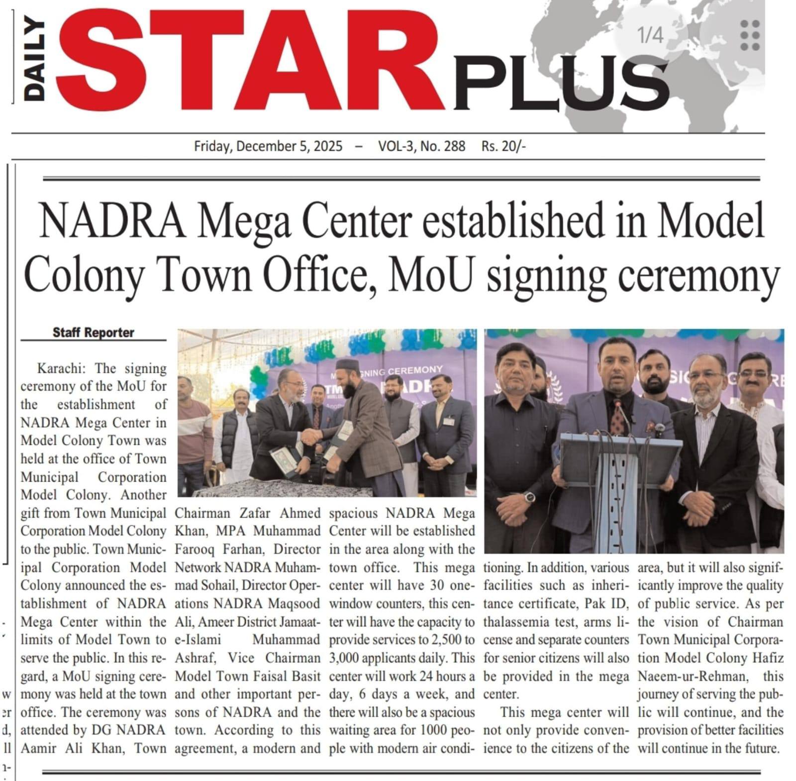 ٹاون میونسپل کارپوریشن ماڈل کالونی نے عوام کی خدمت کے لیے ماڈل ٹاؤن کی حدود میں نادرا کے ایک گرینڈ میگا سینٹر کے قیام کا اعلان کردیا۔ اس سلسلے میں ٹاؤن کے دفتر میں مفاہمتی یادداشت پر دستخط کی تقریب کا انعقاد
