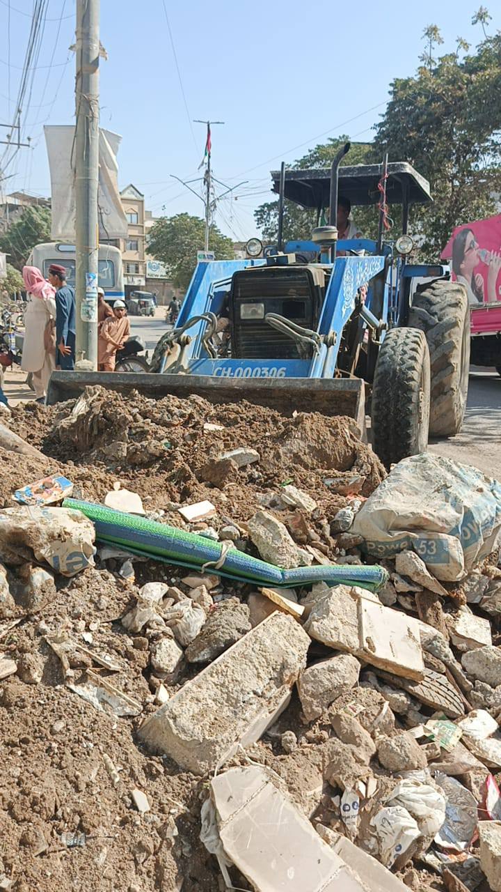 ڈپٹی کمشنر ڈسٹرکٹ کورنگی مسعود بھٹو کی ہدایت پر ماڈل کالونی ٹاؤن/ سب ڈویژن ماڈل کالونی میں انسداد تجاوزات آپریشن۔