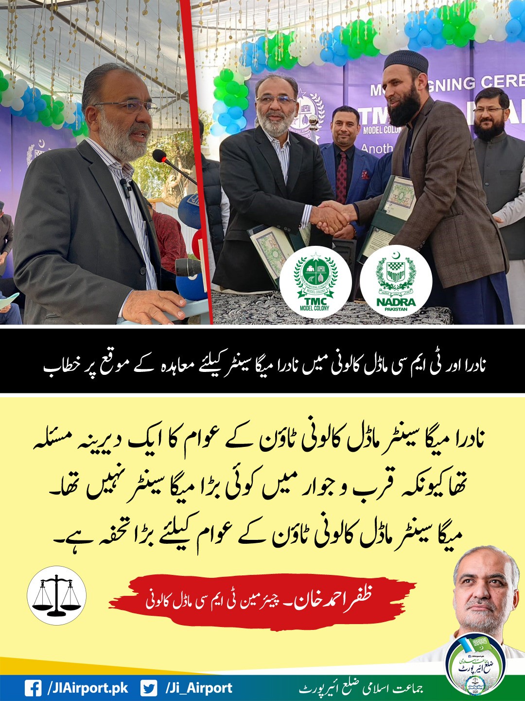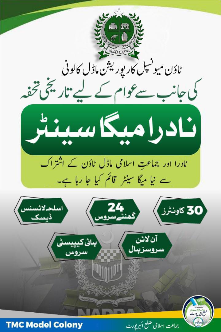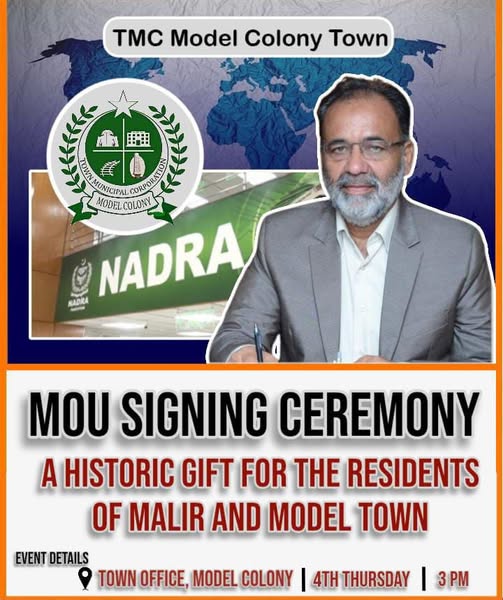 ماڈل کالونی ٹاؤن کا عوام دوست قدم نادرا میگا سینٹر کا قیام ہوگا، کل نادرا اور ٹی ایم سی کے درمیان ایم او یو پر دستخط ہوں گے