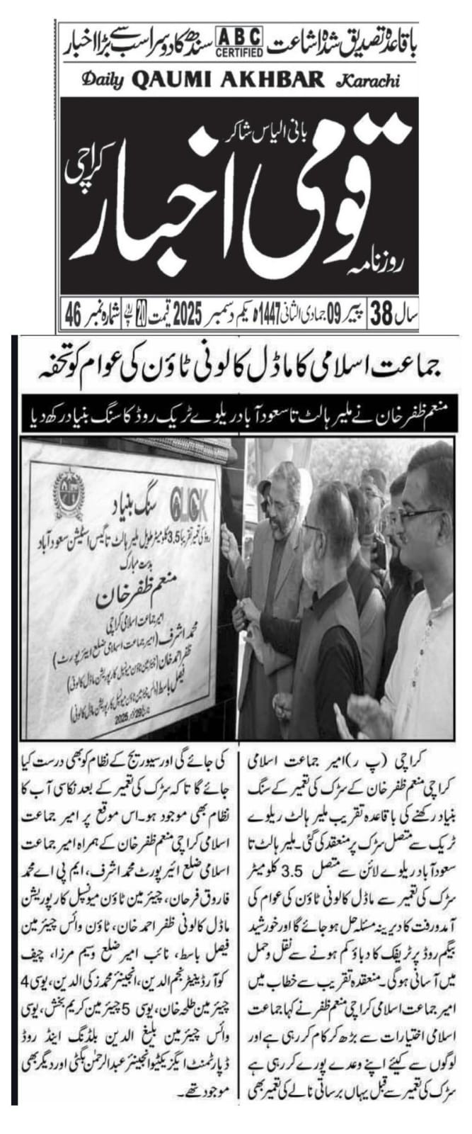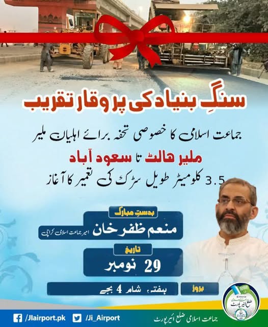 ملیر ہالٹ تا سعود آباد سڑک کی تعمیر کا سنگِ بنیاد امیر جماعت اسلامی کراچی منعم ظفر خان نے رکھ دیا