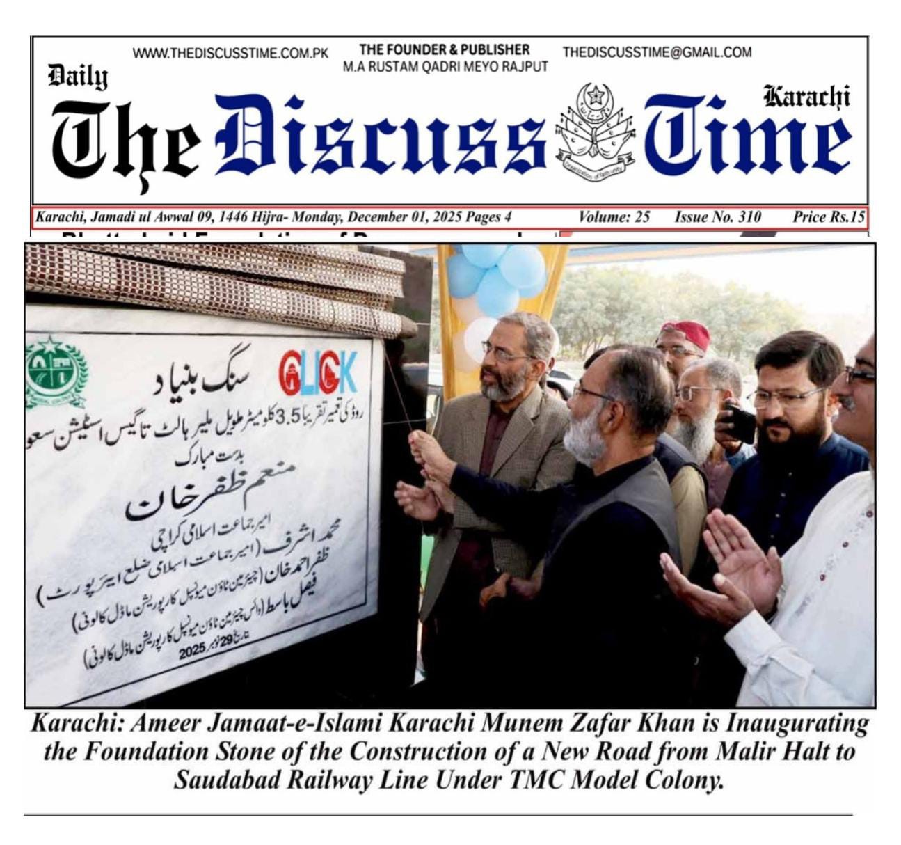 امیرجماعت اسلامی کراچی منعم ظفرخان ٹاؤن میونسپل کارپوریشن ماڈل کالونی کے تحت ملیر ہالٹ تا سعودآباد ریلوے لائن کے ساتھ طویل سڑک کی تعمیر کا سنگ ِبنیاد رکھ رہےہیں اور میڈیا سے گفتگو کررہےہیں۔