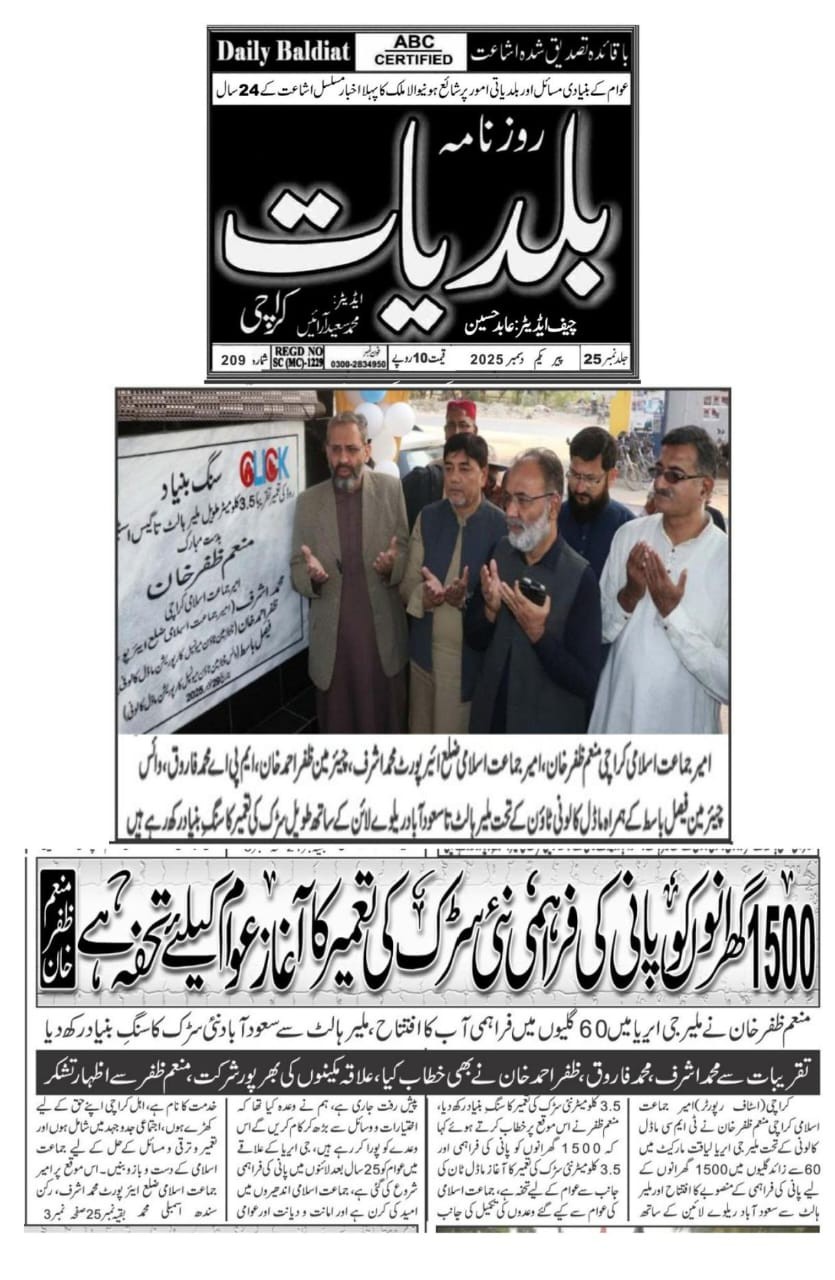 امیر جماعت اسلامی ضلع ائیرپورٹ محمد اشرف نے ٹاؤن چیئرمین ظفر احمد خان، یوسی 3 چیئرمین عبدالمعیز کے ہمراہ یوسی 3 کالونی اسپورٹس تا پاک اسٹار گراؤنڈ، ڈگری کالج روڈ کی تعمیر کے کام کا معائنہ کیا۔