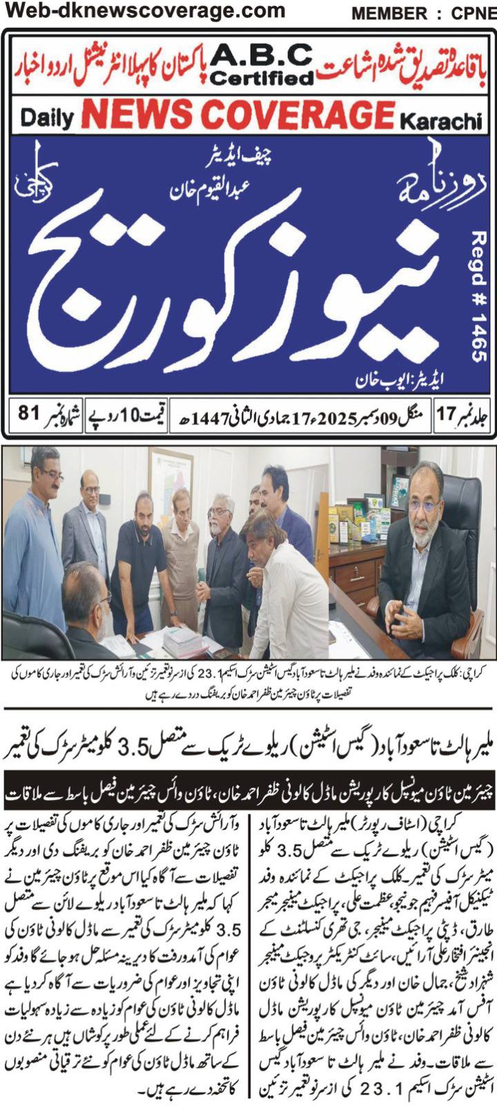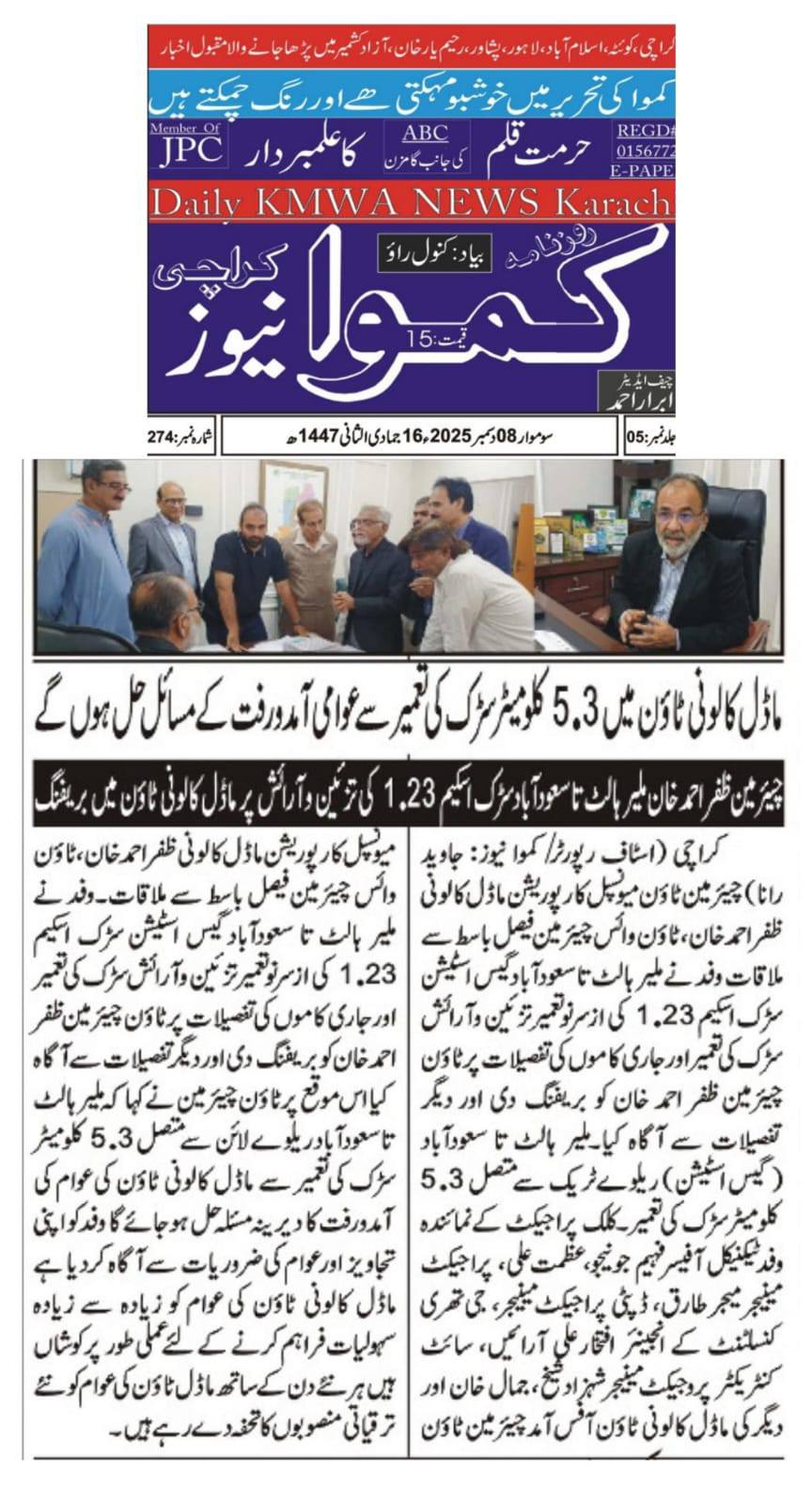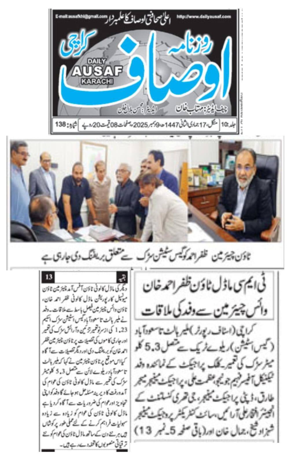 قانون کی خلاف ورزی اور بغیر اجازت روڈ کٹنگ برداشت نہیں کی جائے گی ٹاؤن چیئرمین ظفر احمد خان چیئرمین ٹاؤن میونسپل کارپوریشن ماڈل کالونی ظفر احمد خان سے سوئی سدرن گیس کمپنی کے حکام کی ملاقات۔