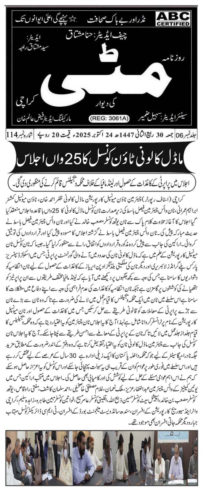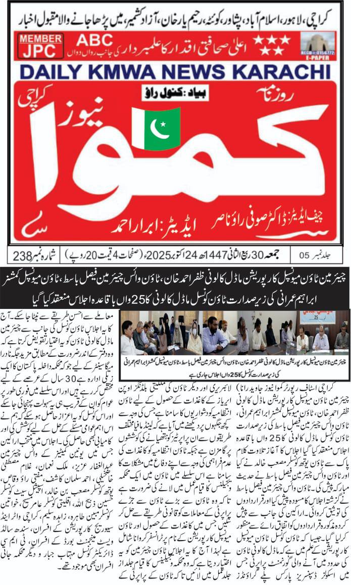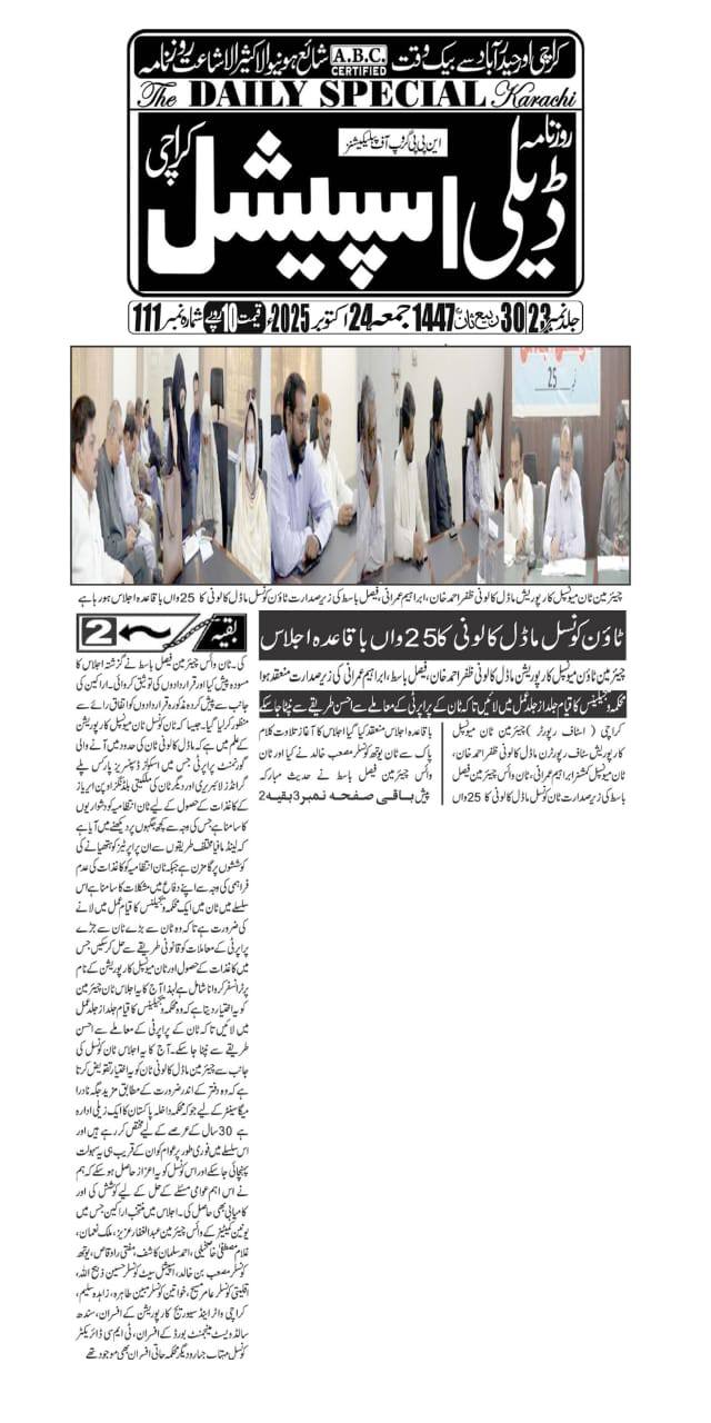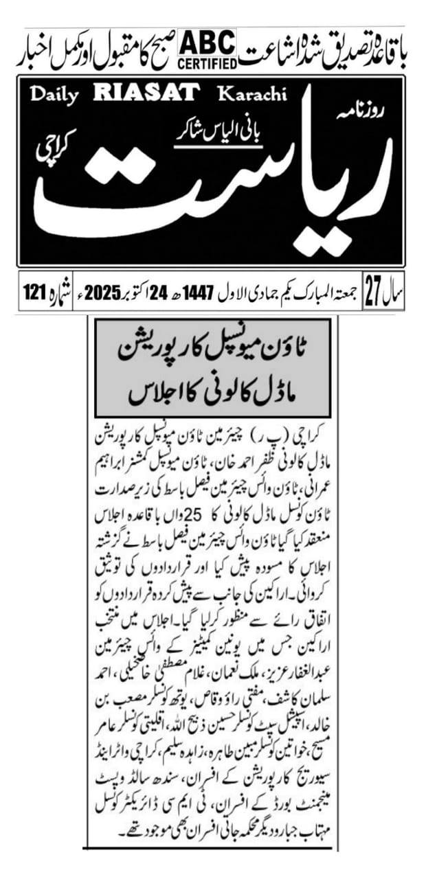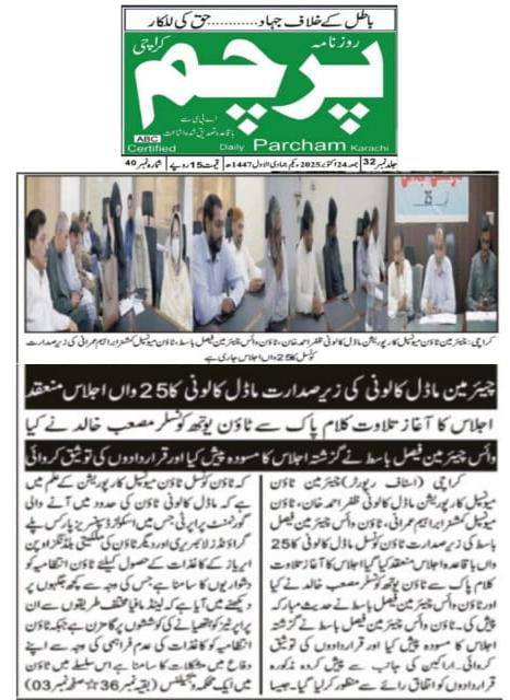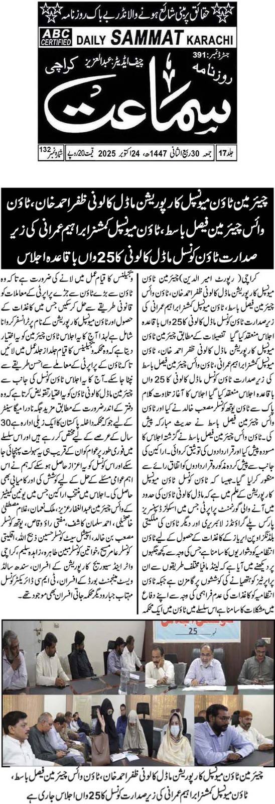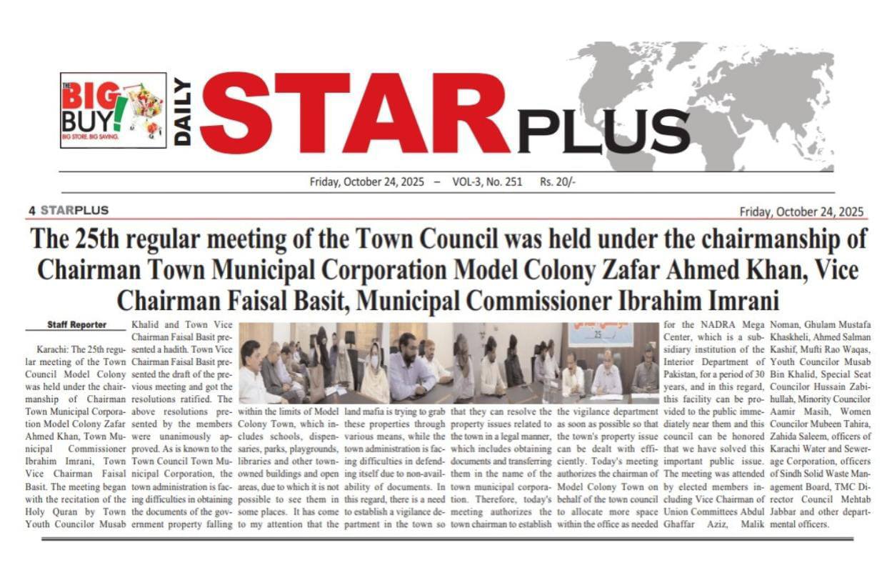 چیئرمین ٹاؤن میونسپل کارپوریشن ماڈل کالونی ظفر احمد خان، ٹاؤن میونسپل کمشنر سید امداد علی شاہ، ٹاؤن وائس چیئرمین فیصل باسط کی زیر صدارت ٹاؤن کونسل ماڈل کالونی کا 22 واں باقاعدہ اجلاس منعقد