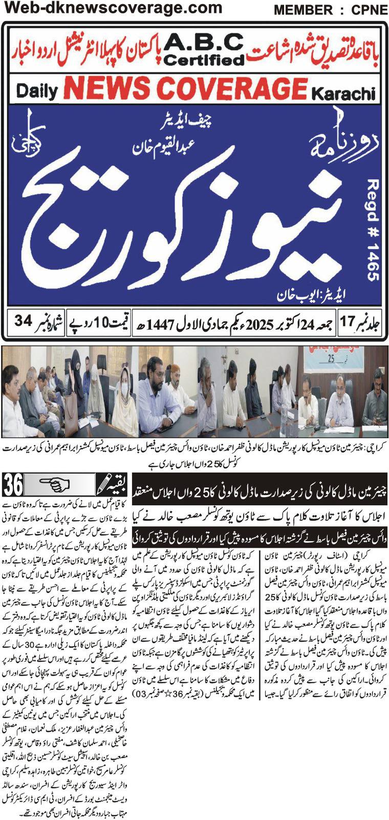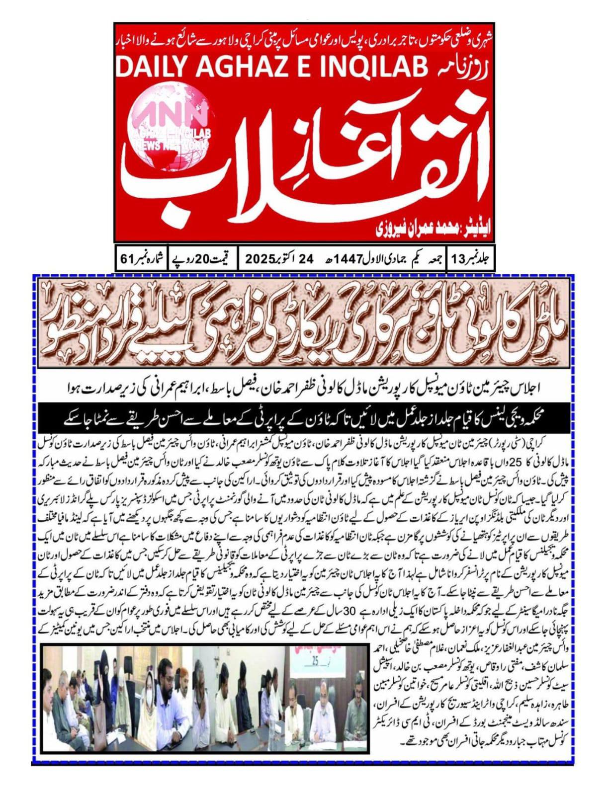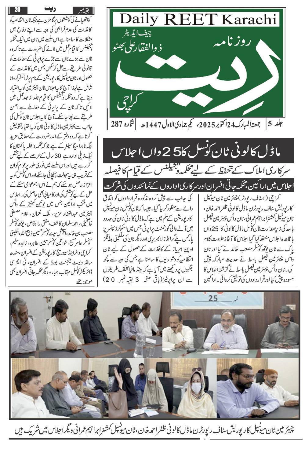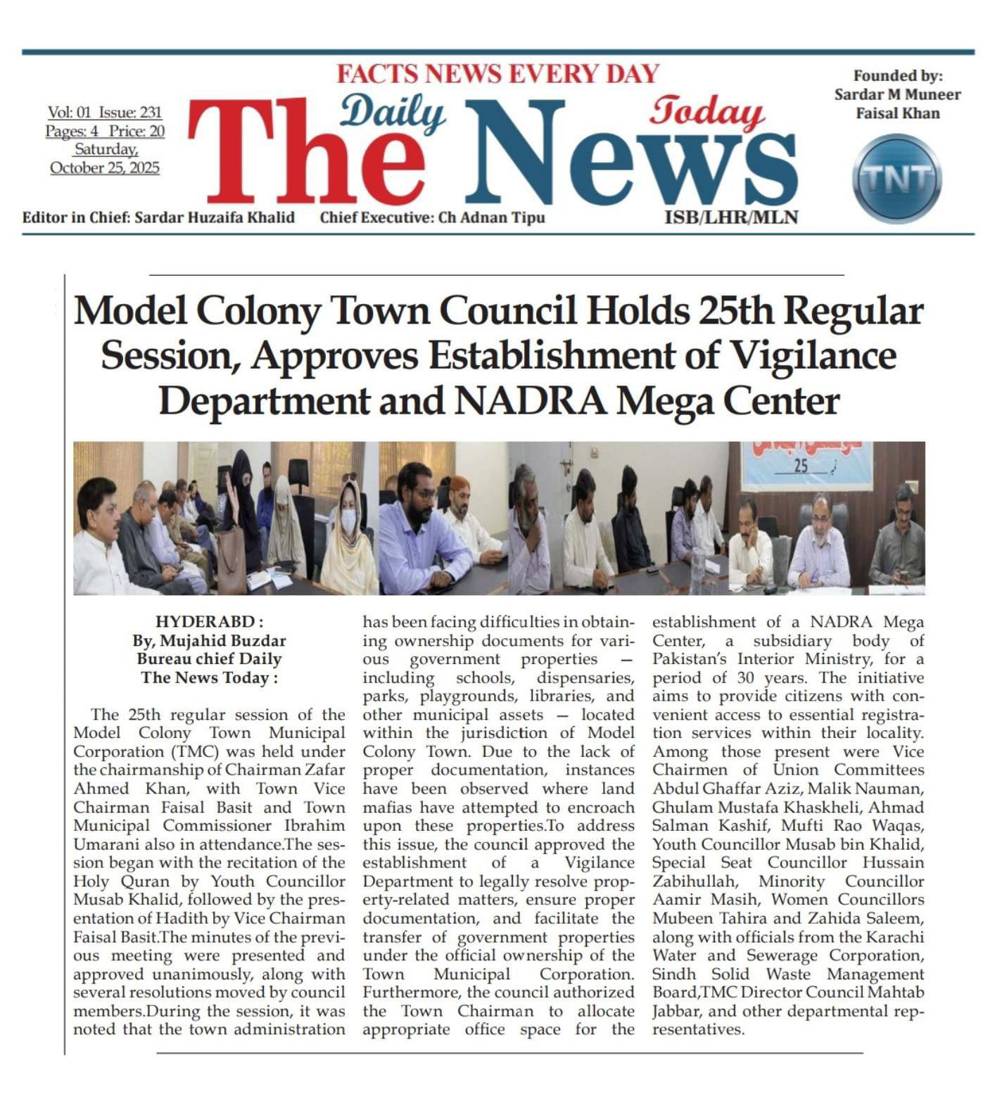 چیئرمین ٹاؤن میونسپل کارپوریشن ماڈل کالونی ظفر احمد خان، ٹاؤن میونسپل کمشنر سید امداد علی شاہ، ٹاؤن وائس چیئرمین فیصل باسط کی زیر صدارت ٹاؤن کونسل ماڈل کالونی کا 22 واں باقاعدہ اجلاس منعقد